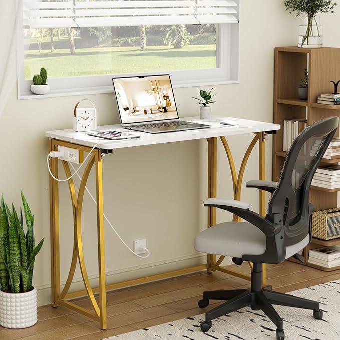 Folding Desk, 31.5" Small Desk for Bedroom with Power Outlet, Space Saving Foldable Computer Desk for Home Office, Easy Assembly, White and Gold