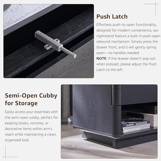 • Handle-Free Design – Clean and modern design,features Push-to-Open drawers for easy and convenient operation.Adjustable push-latch mechanism and smooth glides ensure quiet, handle-free convenience—perfect for maintaining a clean, streamlined space.While the rounded edges ensure safety for kids and families.