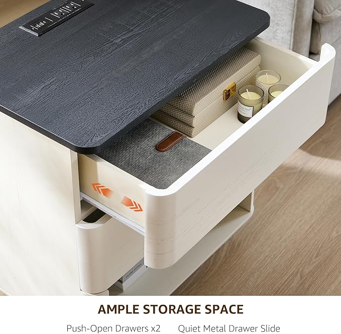 • Spacious & Practical Design – Features a spacious 22" x 15.7" desktop, perfect for holding your laptop, alarm clock, table lamp, and daily essentials. The semi-open cubby offers quick access to remotes, books, and more while keeping your space tidy. Built-in charging station on the tabletop lets you power up your devices with ease.