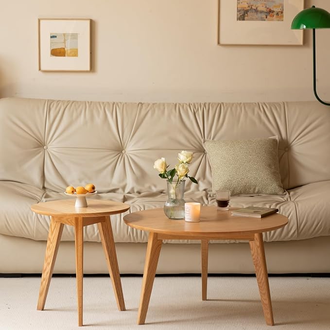 100% Solid Oak Wood Coffee Table Set, Round Coffee Table Combo Side Table w/Solid Wood Legs, Mid Century Table Sturdy Tables for Bedroom Balcony Living Room (Natural, 3 Pieces)