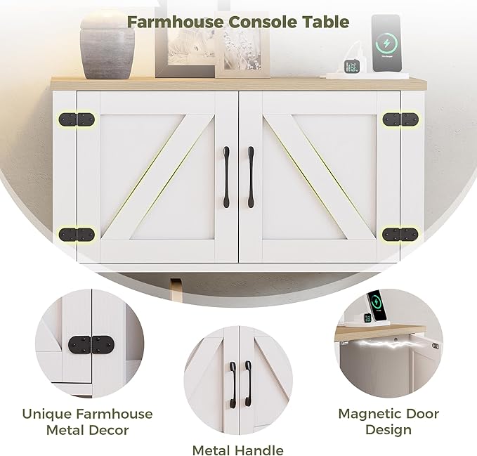 IRONCK Farmhouse Console Table with Storage Cabinet, Entryway Table with Shelf, Coffee Bar with Power Outlets for Hallway Kitchen Living Room, White