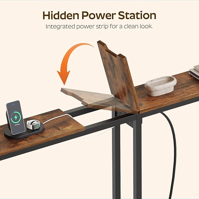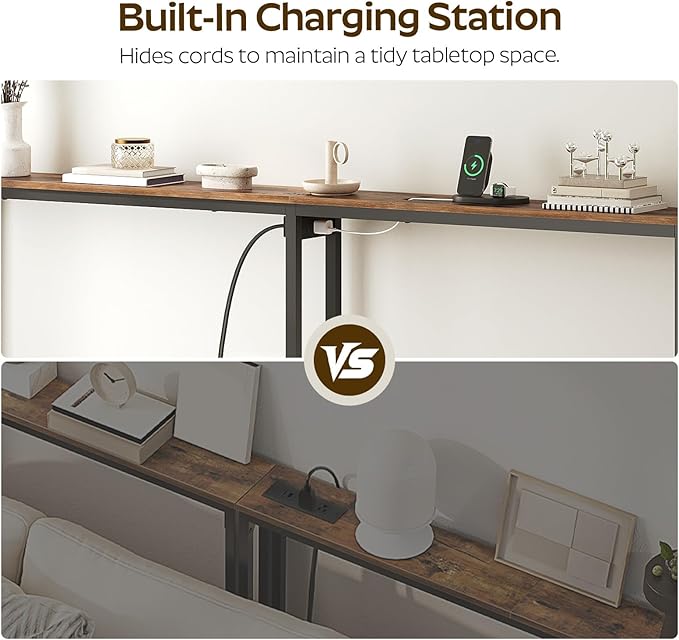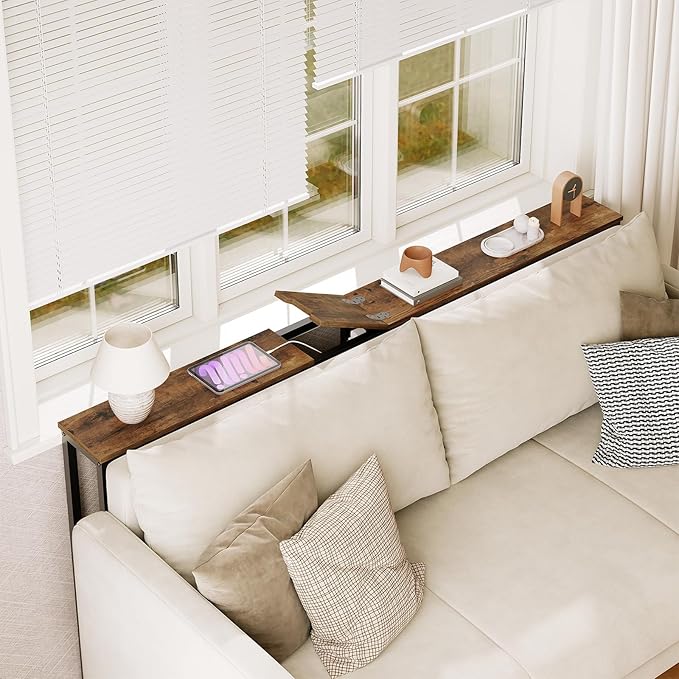 • Declutter with Hidden Power: The behind couch table's clever flip-top lid reveals a power strip, allowing you to power devices and keeping the wires out of sight. Keep the 70.9"L surface clear for decorations while your gadgets charge conveniently
