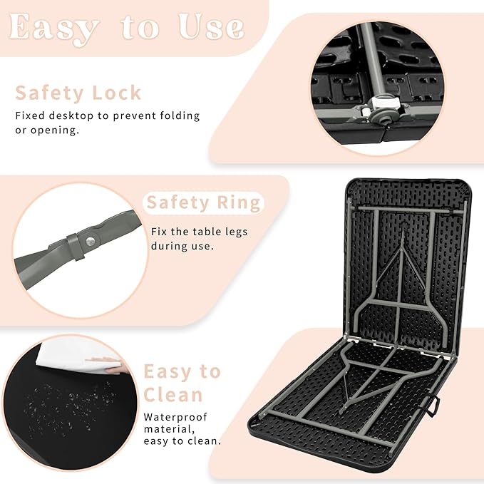 • Multi Functional Outdoor Table:The surface of this folding table is smooth and sturdy, easy to wipe, and the table corners are designed with rounded corners for safety and reliability. The anti slip covers on the four table legs prevent the table from shaking freely and protect the floor from scratches. Each table can accommodate 4-8 people, making it the best choice for outdoor camping, indoor activities, picnics, offices, birthday parties, banquets, weddings, craft fairs, kitchen table, and other events.