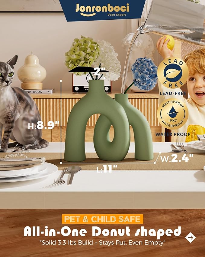 Hug Donut Decorative Vase Set - Sage Green Modern Nordic Boho Style Vases Home Decor,Matte Ceramic Decorations for Living Room Shelf, Bookshelf Mantle Entryway Table or Console Décor(Green)