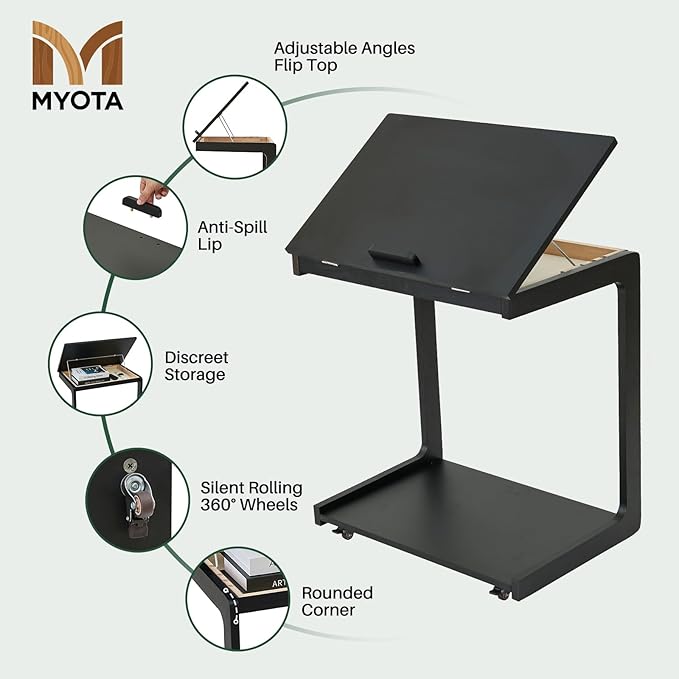 • Smart Functional Table: 360° Wheeled side table glides chair side to bedside. Tilt top 25° 35° 50° for ergonomic laptop work, reading, comfortable dining, binge watching as a portable TV tray. Ideal small coffee table for snacks, drinks and essentials