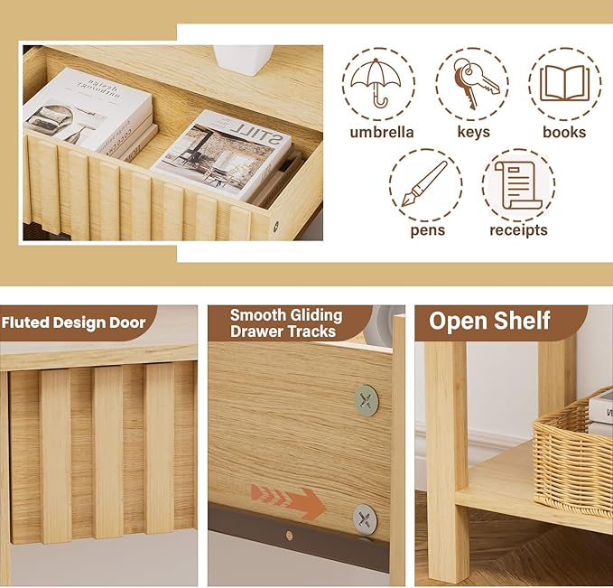 • Ample Storage Space: With two spacious fluted drawers and an open bottom shelf, this console table with storage offers plenty of room to keep your essentials tidy. Use the drawers for personal items and the shelf for decorative accents or storage baskets, making it perfect for living room tables or any entryway