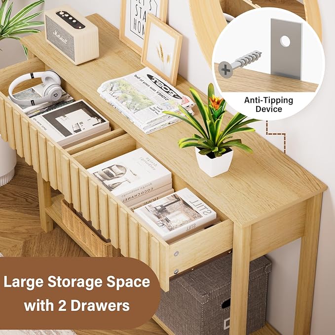 CHUWELL 47.2" Boho Entryway Table, Entryway Console Table with 2 Fluted Drawers and Shelf, Sofa Table for Living Room and Hallway (Oak)
