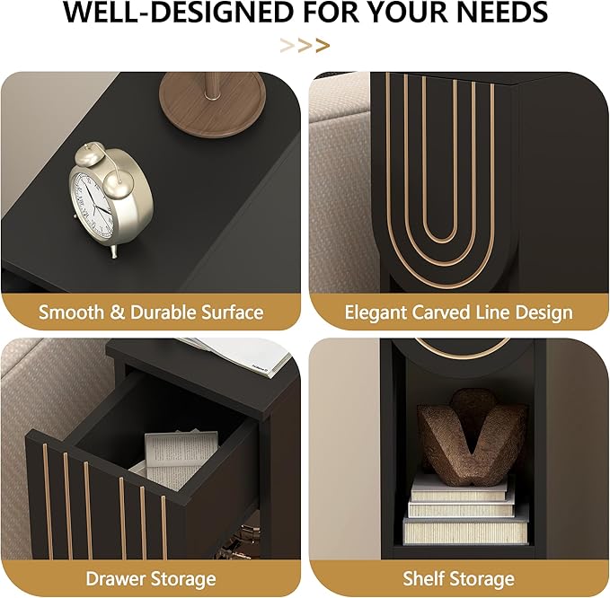 Narrow Nightstand, Black Bedside Table with Carving Lines Drawer, Mid-Century Modern Slim Side End Table for Bedroom Small Space, Wooden Small Night Stand (1, Black)