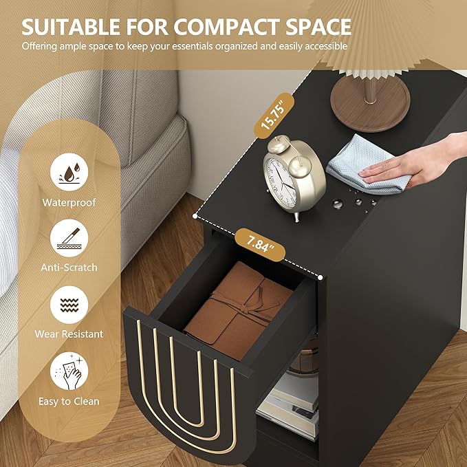 • 【Space-Saving Slim Profile】Designed with small spaces in mind, this slim bedside table fits easily beside low beds, sofas, or in tight corners—ideal for apartments, dorms, or cozy bedrooms needing smart use of space.