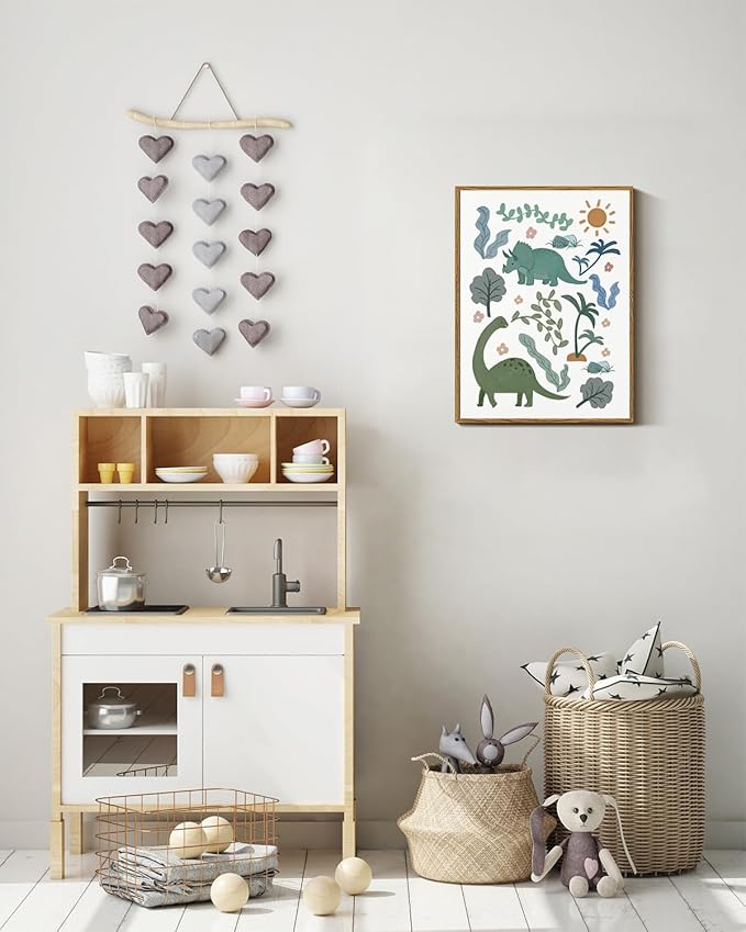 • Nursery Wall Art: Muted greens, blues, and pinks create a calming, gentle vibe. Blends cute dinosaur motifs with nature elements, ideal for adding a cozy, imaginative touch to children’s decor
