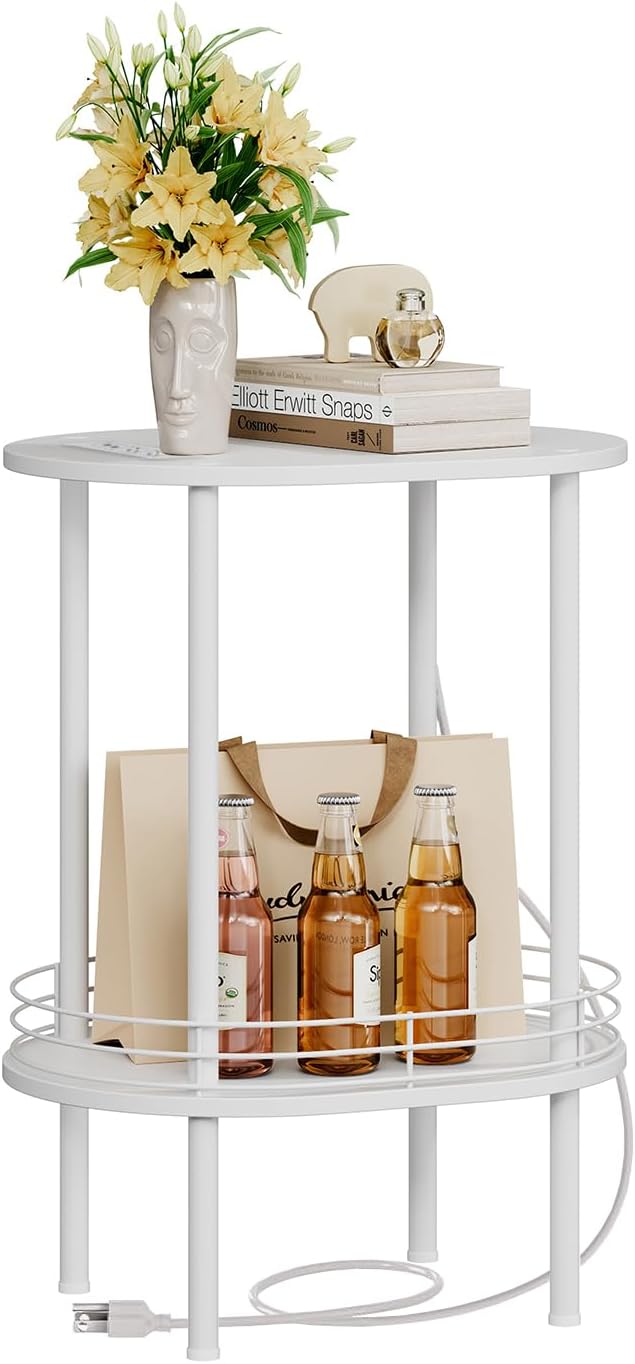Small Round Side Table with Charging Station,Bedside Table with 2 USB Ports and Outlets, Morden Round Nightstand, Samll Side Table for Living Room,Bedroom, Nursery, Laundry, White