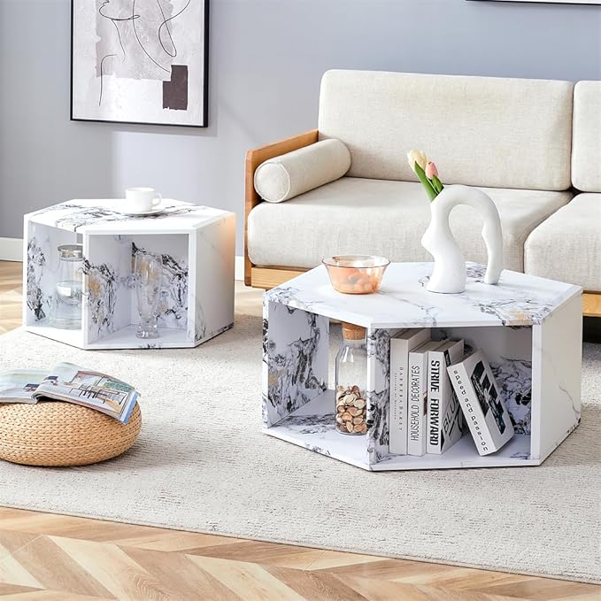 • Smart Storage Compartments-Hexagonal Shape Coffee Table Set: Keep your space tidy with built-in open shelves, perfect for sorting books, decor, drinks, or remote controls. Ideal for small spaces. The compact hexagonal shape maximizes utility without taking up too much room