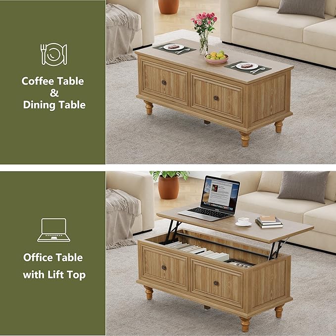 • ERGONOMIC LIFTING DESIGN: Our coffee table is designed with a lifting table top. The lifting mechanism is made of thickened steel frame, you can effortlessly raise it to a comfortable height while keeping it stable (the top can be lifted from 17.71 inches, to 22.91 inches), so you don't have to lean forward to use your laptop on the tabletop, allowing you to enjoy your food, do crafts, or play games comfortably on the couch.