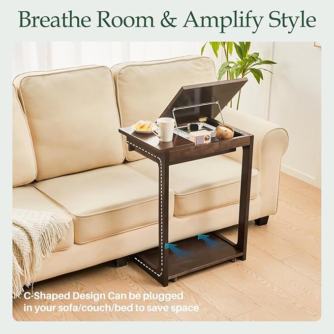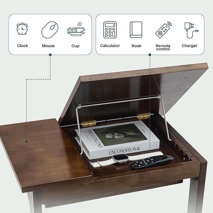 • Multi Purpose Endtable: Practical side table with drawer. Desktop holds snacks/drinks, drawer for valuables and keyboard, lift lid to hidden storage for TV remotes, phones. Open shelf holds books, magazines, or vases. Keeps essentials organized & reachable