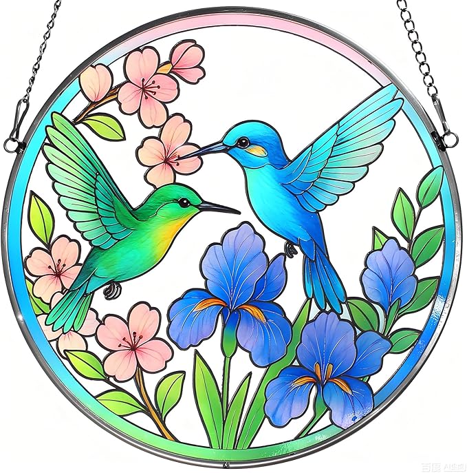 • 【Stunning Stained Glass Decoration】Add a touch of vibrant elegance to your home with this exquisite stained glass hummingbird suncatcher. Featuring two flying hummingbirds amidst pink and purple blossoms with green leaves, this 8.6-inch masterpiece beautifully captures the essence of nature's splendor
