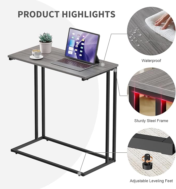 C-Shaped Side Table, Modern End Table with Metal Frame, Space Saving Design for Living Room,Large Surface Couch Table for Bedroom, and Home Office,24 x 12 x 24 inches (Grey)