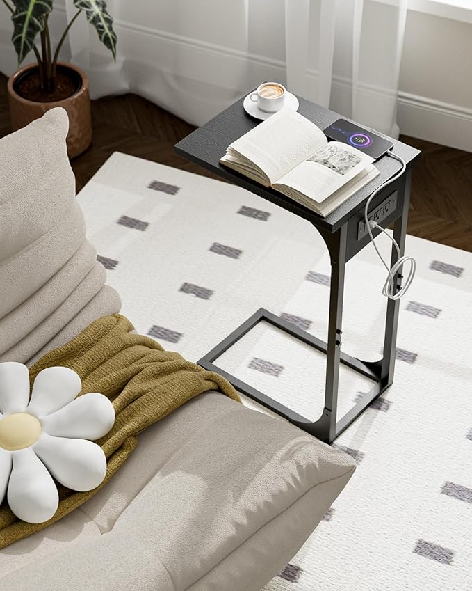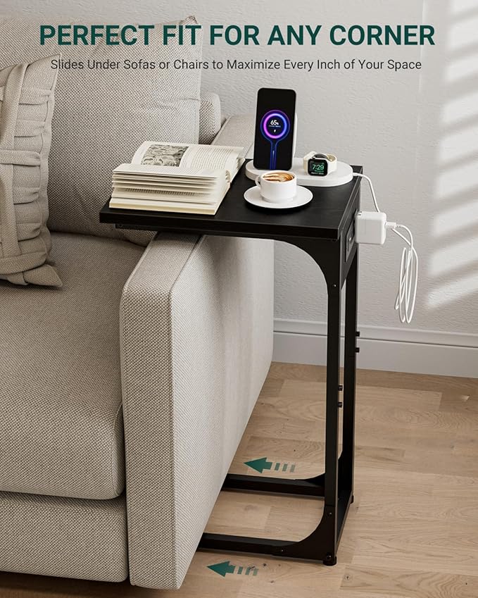 • 👍𝗠𝗨𝗟𝗧𝗜-𝗙𝗨𝗡𝗖𝗧𝗜𝗢𝗡𝗔𝗟 𝗠𝗢𝗗𝗘𝗥𝗡 𝗦𝗧𝗬𝗟𝗘 — With a minimalist yet modern look, this c shaped end table doubles as a sofa table, small coffee table, or laptop desk, while also serving as a tv tray for eating on couch. It now features a built-in charging station, keeping your devices powered without clutter. Blending into any living room, bedroom, or office décor, it offers versatility as a couch desk, bedside table, or under couch table