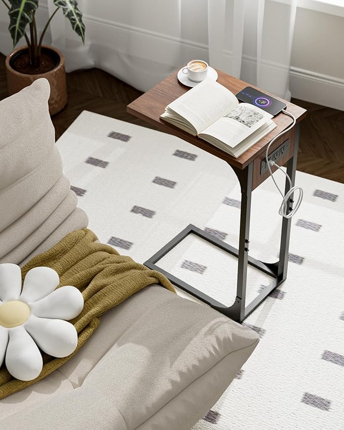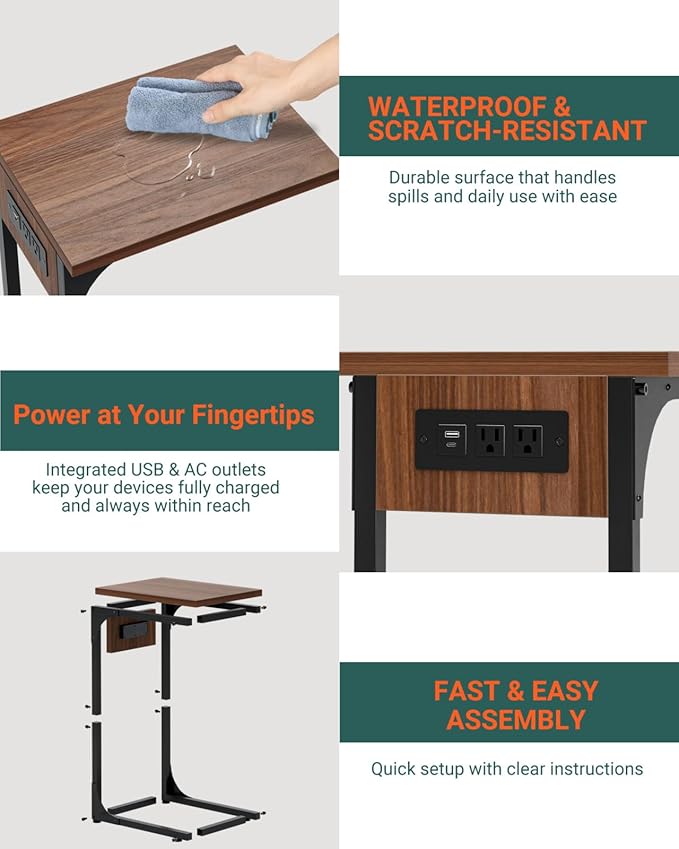 C-Shaped Side Table for Couch - Small Coffee Stand Sofa Tray Desk with Metal Frame Waterproof Scratch Resistant Wood Top and Built-in Charging Station, Rustic Walnut