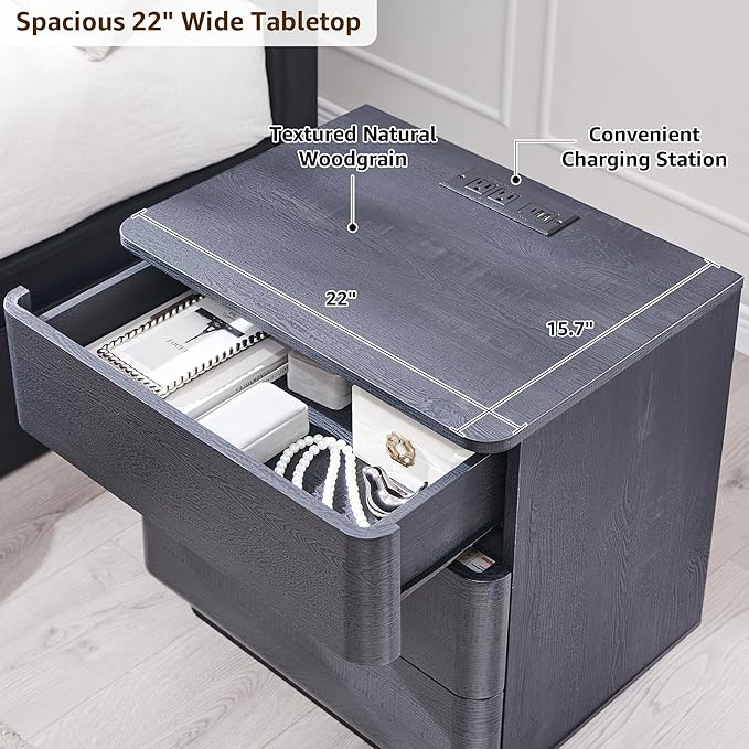 ACCOHOHO 22" Modern Nightstand with Charging Station, Push-to-Open Handleless 3 Drawers Bedside Table, Large End Table with Storage, Night Stand for Bedroom, Living Room, Curved Profile, Black