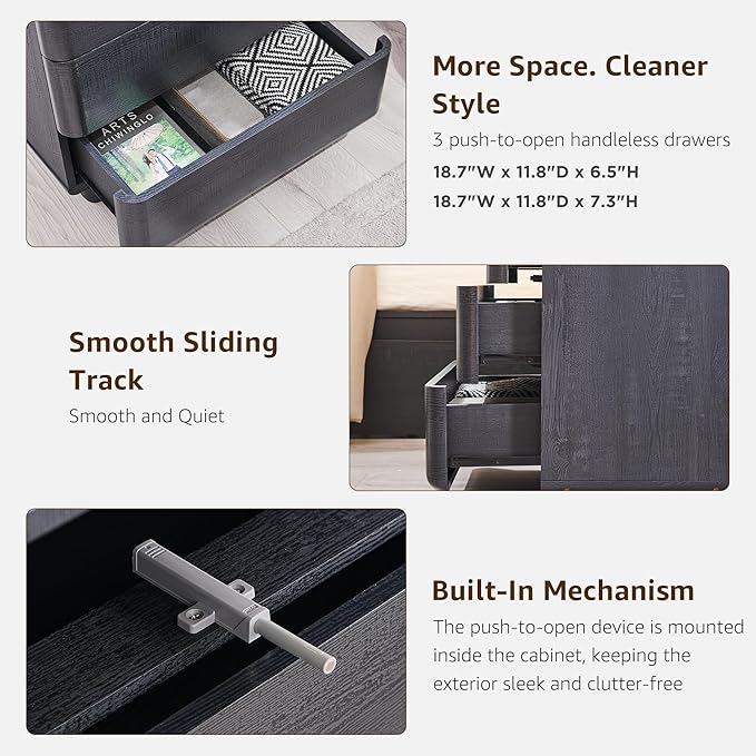 • 3 Push-to-Open Drawers for Effortless Storage: Featuring 3 spacious drawers(18.7"W x 11.8"D x 6.5"H & 7.3"H) with push-to-open functionality, this night stand makes organizing easy and clutter-free for those who dream of a smooth, minimalistic bedroom without knobs or handles. Just tap to open — push openers are mounted inside the cabinet, allowing you to open the door without knobs or handles for a clean, sleek room look. perfect for storing books, remotes, chargers, or daily essentials