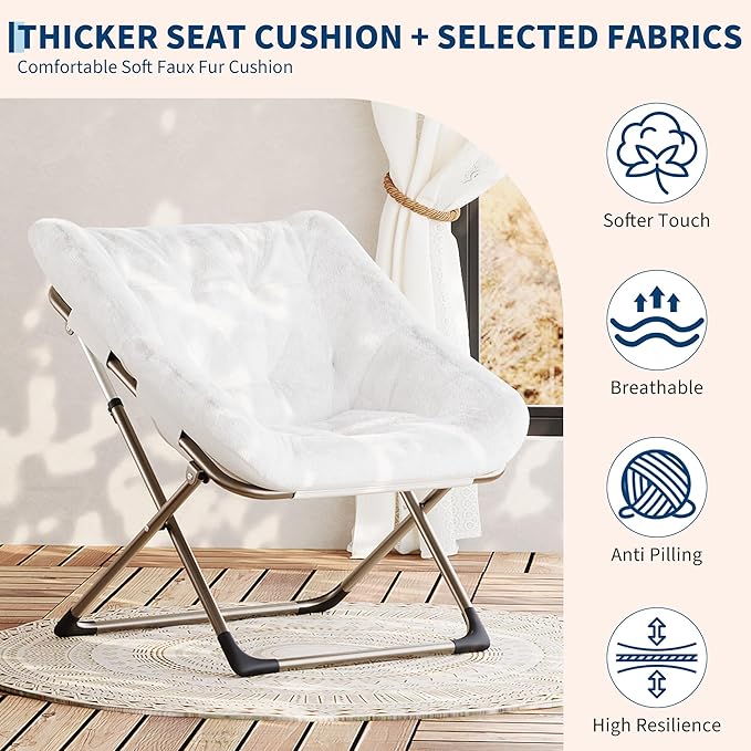 Folding Saucer Chair for Adults, Comfortable Living Room Lounge Chair with Soft Faux Fur Cushion, No Assembly Required, Foldable Accent Furniture for Apartments/Dorms/Bedrooms, White