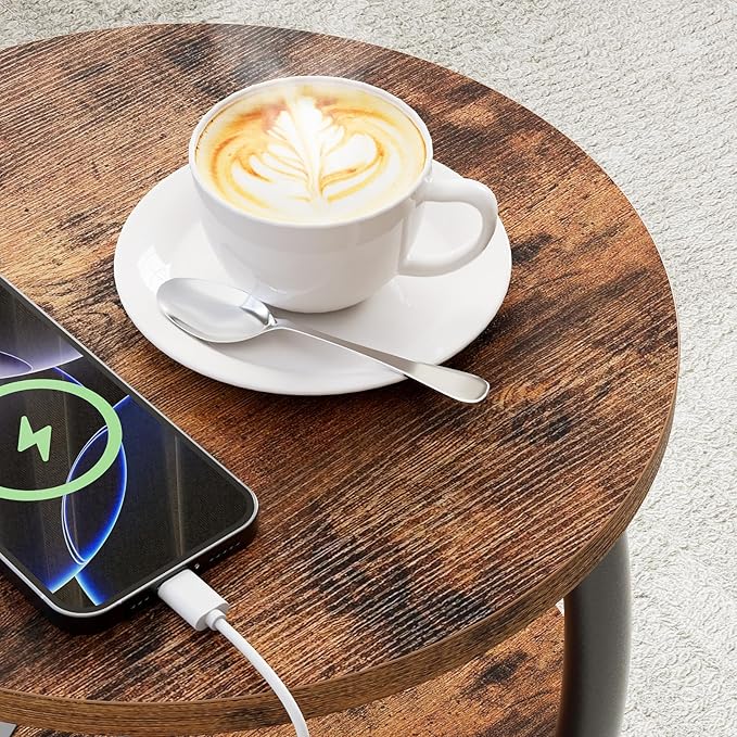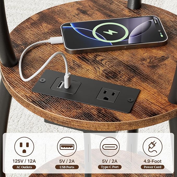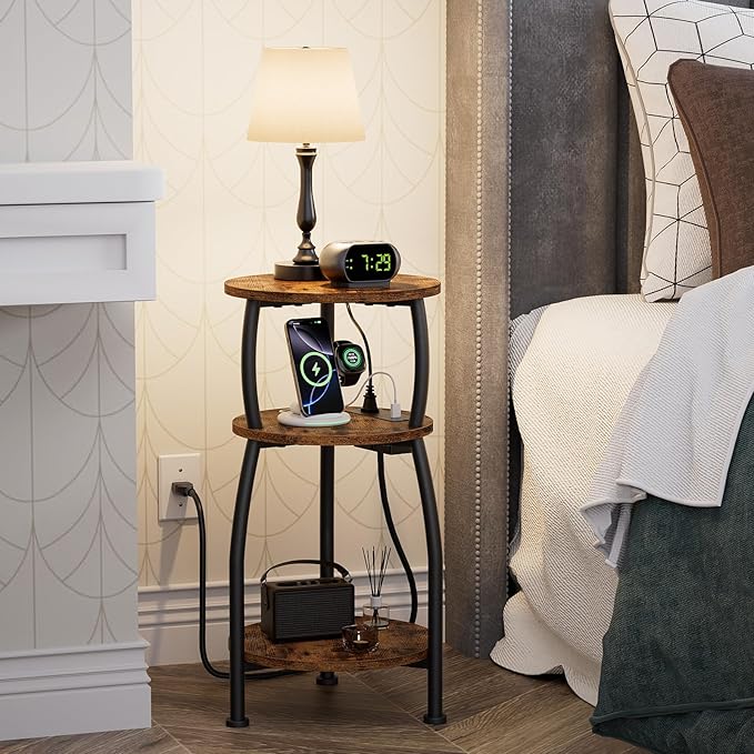 Round Side Table with Power Outlet & USB Ports, 3-Tier End Table with Storage Shelf, Modern Rustic Nightstand, Small Spaces Accent Table for Living Room Bedroom, Easy Assembly, Rustic Brown