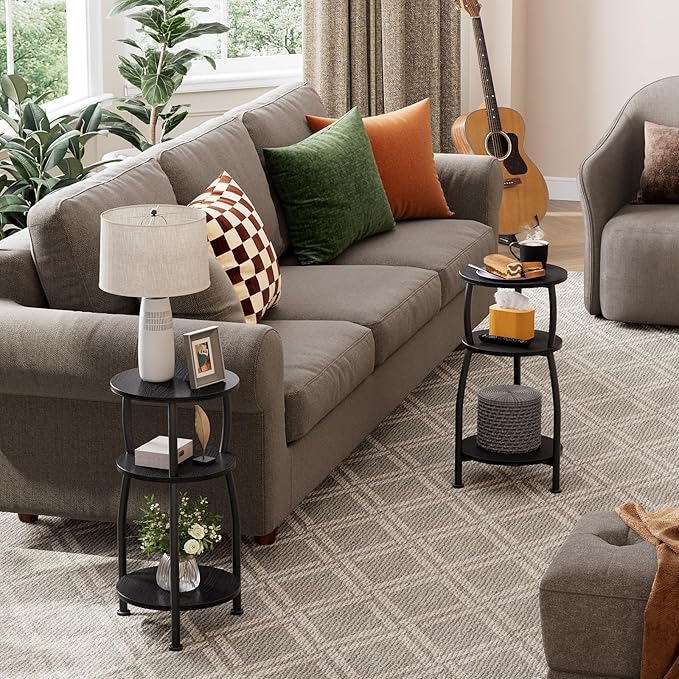 Small Round Side Table, 3-Tier End Table with Storage Shelf, Slim Sofa Table Coffee Table, Sturdy & Easy Assemble Nightstand for Small Spaces, Living Room Bedroom Corner, Black