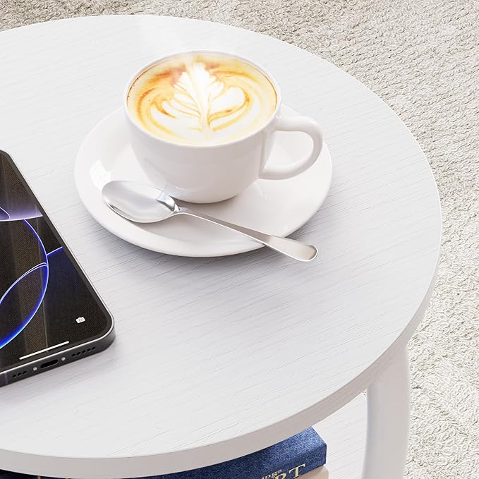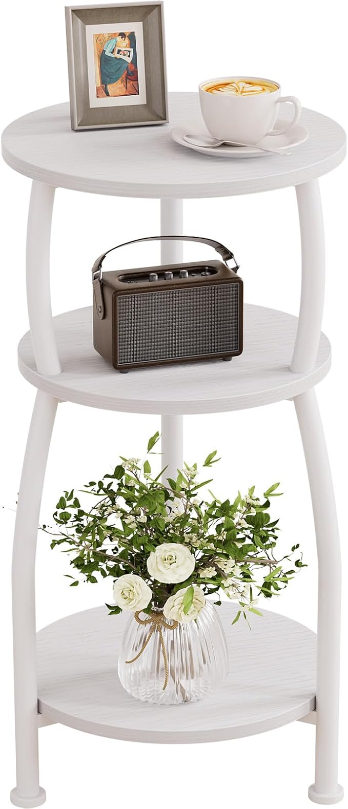 Small Round Side Table, 3-Tier End Table with Storage Shelf, Slim Sofa Table Coffee Table, Sturdy & Easy Assemble Nightstand for Small Spaces, Living Room Bedroom Corner, White