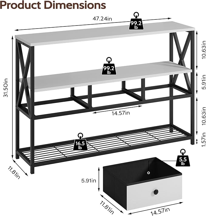 • Ample Storage with Functional Fabric Drawers: Solve clutter problems easily! The table comes with 3 fabric drawers featuring easy - pull arch handles. Made of breathable, dust - proof non - woven fabric, these drawers neatly store keys, remotes, and small items. Open shelves provide extra space for displaying decor, books, or gaming consoles. Keep your entryway or living room organized and tidy.