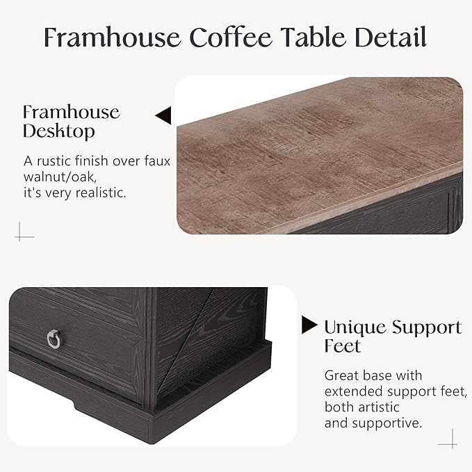 • Farmhouse Coffee Table: With a unique rustic wood grain finish, as if saying a story of nature. Matches your another home furnitures to create a cosy, clean atmosphere. Placed in your living room, study room, or home office, it's a good choice for palying game, work, or party.