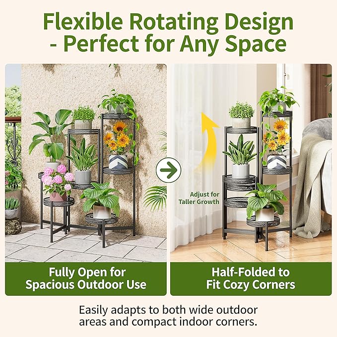 • 【ONLY 5-Minute Assembly & Space-Saving】Enjoy a tool-free, screw-free setup 5-minutes with a detailed manual with installation steps. The corner plant stand indoor outdoor & folding tall rack features a fixed center pole and smoothly rotating outer legs, allowing you to adapt its shape to fit corners or straight walls, saving space and fold it for compact storage