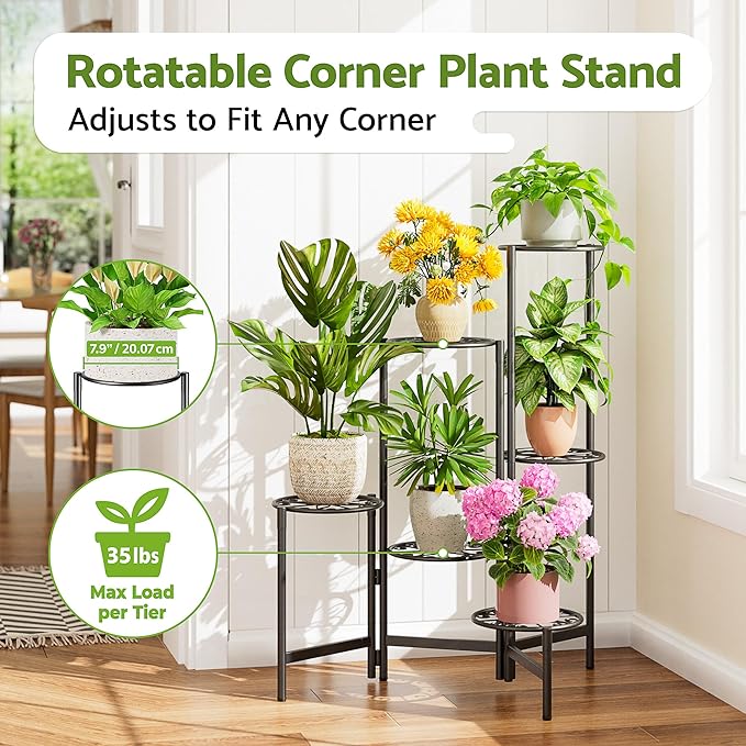 6 Tier Large Plant Stand Indoor with 7.9-Inch Wide Drainage Tray, Tiered Corner Metal Outdoor Flower Display Holder Shelf, Folding Tall Rack for House Patio Porch Balcony Graden - BlackS