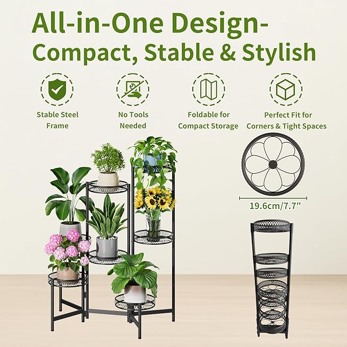 • 【ONLY 5-Minute Assembly & Space-Saving】Enjoy a tool-free, screw-free setup 5-minutes with a detailed manual with installation steps. The corner plant stand indoor outdoor & folding tall rack features a fixed center pole and smoothly rotating outer legs, allowing you to adapt its shape to fit corners or straight walls, saving space and fold it for compact storage