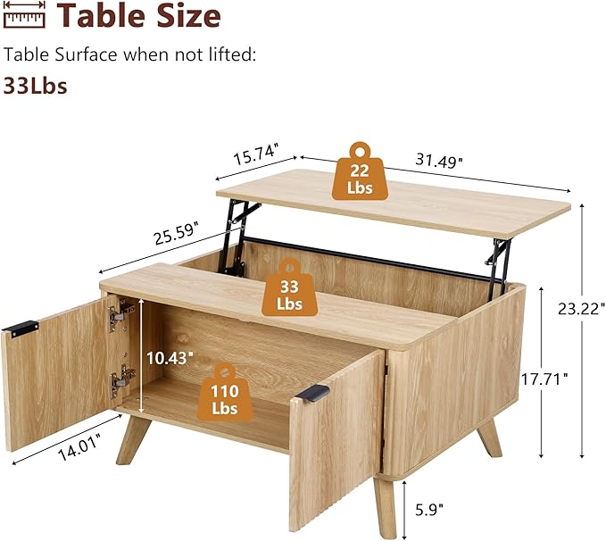 • 【Sturdy Structure】High quality lift top mechanism enables the tabletop to be lifted up or lowered down effortlessly and noiselessly, Children don't have to worry about hurting their fingers when using. With solid construction and selected materials, this coffee table will not wobble if correctly assembled.