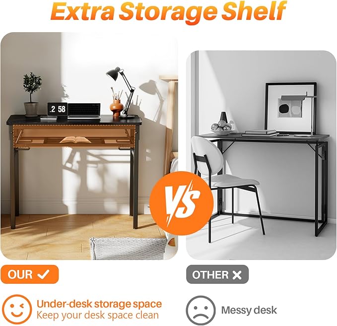 BYMECOST 39.4" Folding Desk, No Assembly Computer Desk, Small Foldable Table with Storage Shelf, Study Table for Small Space, Writing Desk Compact Desk for Home Office (Black, 39.4")