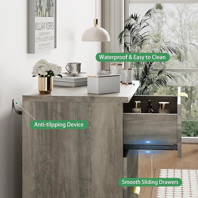 • 【Solid Material & Sturdy Construction】The bedroom nightstand is constructed from optimal MDF, P2 engineered wood and coated metal handle which not only has exquisite texture, but also ensure long-term use and scratch resistant. Each drawer holds up to 35 lbs and the thickened tabletop can support up to 75 lbs. For easy cleaning, just wipe with damp cloth and get it air-dried