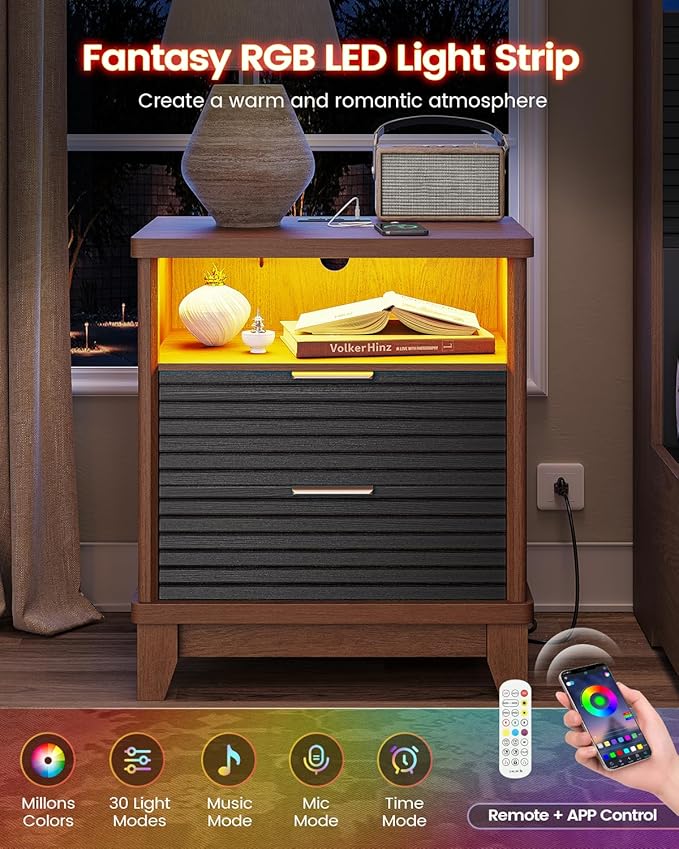 AOGLLATI Fluted Nightstand with Charging Station and 2 Drawers, Black Nightstand, Beside Table with Open Storage and Led Lights, Retro End Side Table for Bedroom, Black