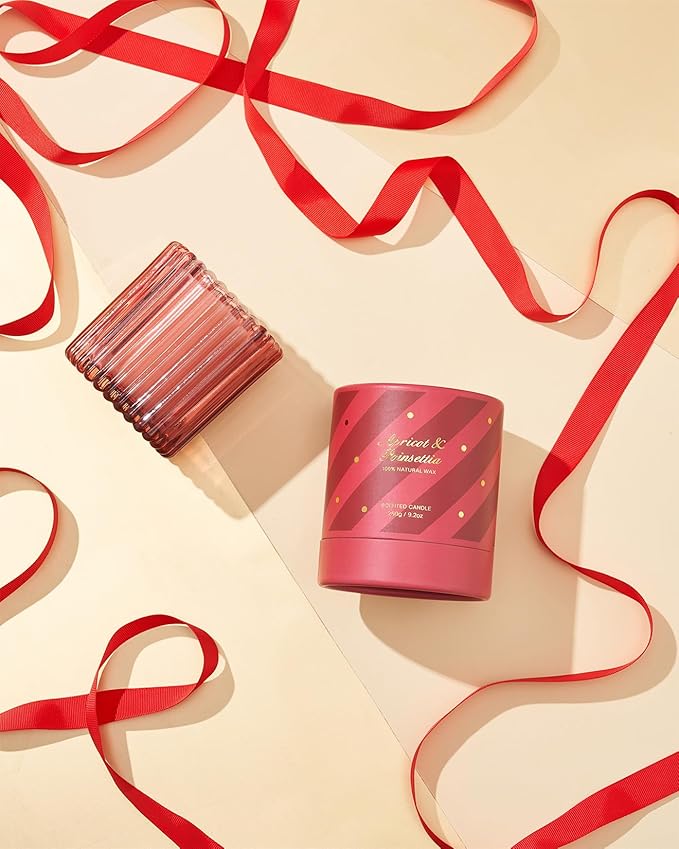 • Christmas Gift Box - This scented candle comes in an elegant packaging adorned with Christmas-themed strips and matching gold polka dots, creating a festive Christmas atmosphere. The striped glass candle jar is suitable for any home decoration. Place the gift box under the Christmas tree for an added touch of holiday charm.