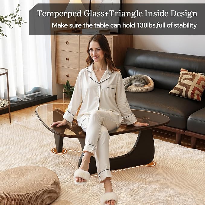• 🌺【𝐒𝐓𝐔𝐑𝐃𝐘 𝐒𝐓𝐑𝐔𝐂𝐓𝐔𝐑𝐄】The unique triangular base (walnut + oak) of this living room table with premium glass not only adds visual interest but also provides exceptional stability. Built to withstand daily use for 130 lbs, ideal for placing drinks, books, or decor without wobbling.