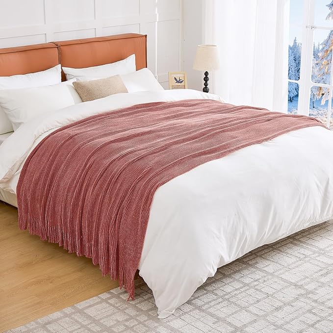 • 【FANTASTICAL COMBINATION】Inspired by minimalist neutral style,this farmhouse knitted throw blanket features a rich Coral Pink color and woven texture,complemented by elegant tassels. It adds cozy Christmas atmosphere to your home or living room.As and Christmas approach, drape this Boho throw blanket over your dining chairs or table,adding a stylish festive touch. After the celebrations,it’s the ideal cozy companion for resting on your bed,sofa, or couch, bringing ultimate comfort and warmth.