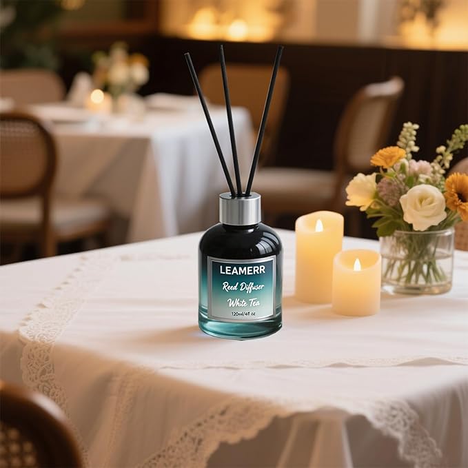 • Scent: White Tea, This diffuser emits a rich camellia scent, Let natural aroma quickly fill your room or bathroom.Top notes: Citrus, Green Tea.Middle notes: Green Tea, Watermelon, Passion Fruit.Base notes: Sandalwood, Amber