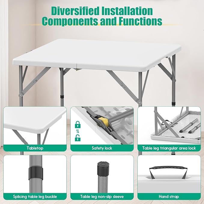 • High-Quality & Sturdy: Constructed with premium HDPE material and reinforced steel legs, our square folding table can hold up to 330 pounds, ensuring long-lasting stability and durability