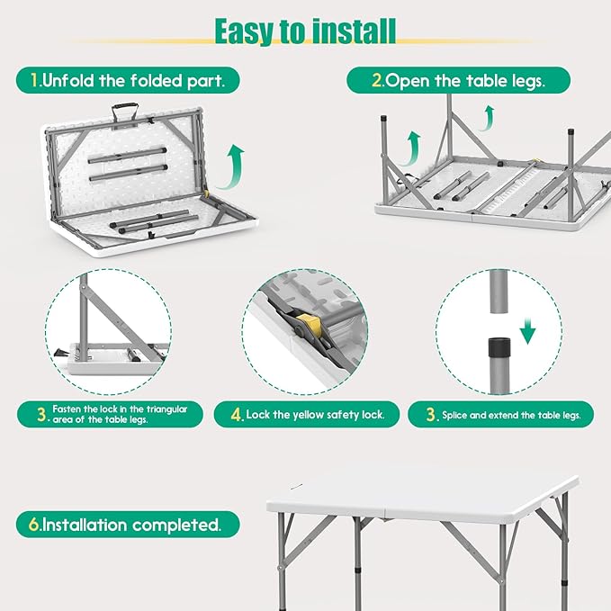 • Safe & Secure Design: Equipped with a safety lock on the back of the table top and four legs add non-slip mats, this foldable table provides added safety and security during use