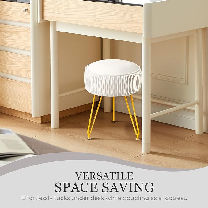 Velvet Vanity Stool Footrests, Round Ottoman Vanity Chairs with Anti-Slip Feet, Dressing Table Seat Foot Stool with Black Legs, Furry Padded Seat Side Table for Makeup Bedroom(White, Golden)