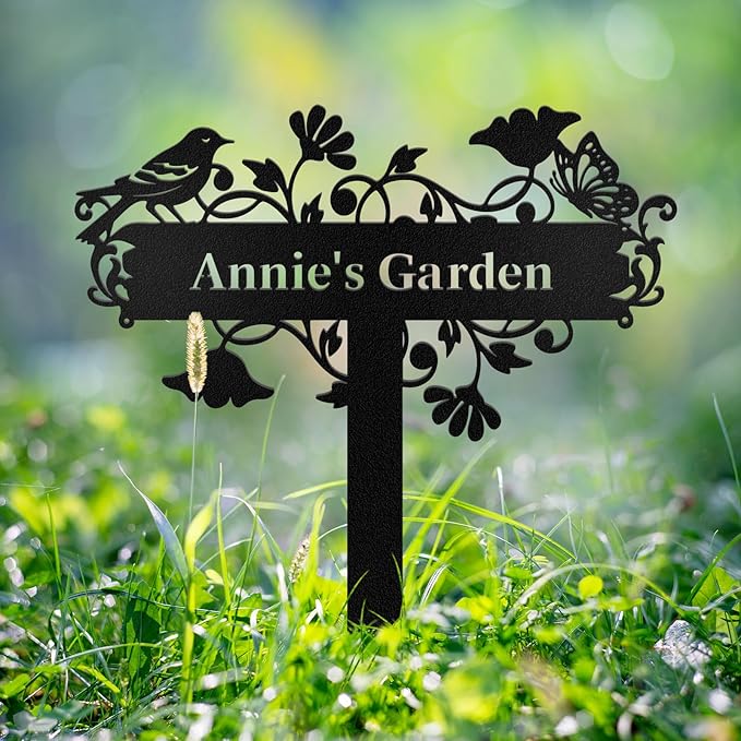 Personalized Garden Signs with Stake, Custom Garden Signs Metal for Outdoor Waterproof, Customized Metal Name Sign, Birds Flowers Design Home Patio Yard Decor Gardening Gift
