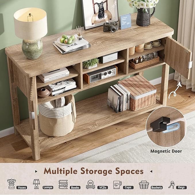 • 【2 Door Cabinets & 3-Tier Shelves Design】This console table features two storage cabinets and three-tier shelving with dividers, offering a mix of open and concealed storage.The two cabinets are ideal for storing coffee beans, tools, canned goods, and more.The open shelves are great for DVDs, books, and everyday essentials.The bottom wooden shelf can hold a laundry basket, helping you maintain a tidy space