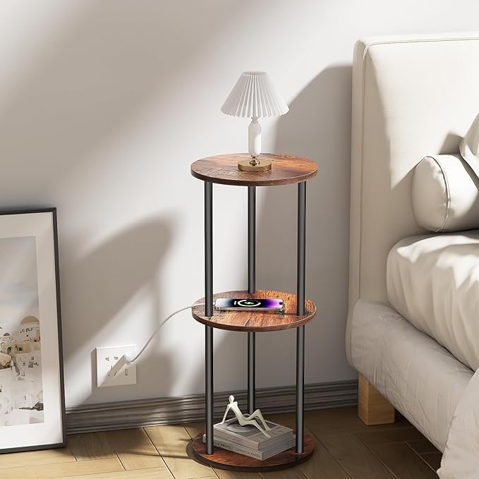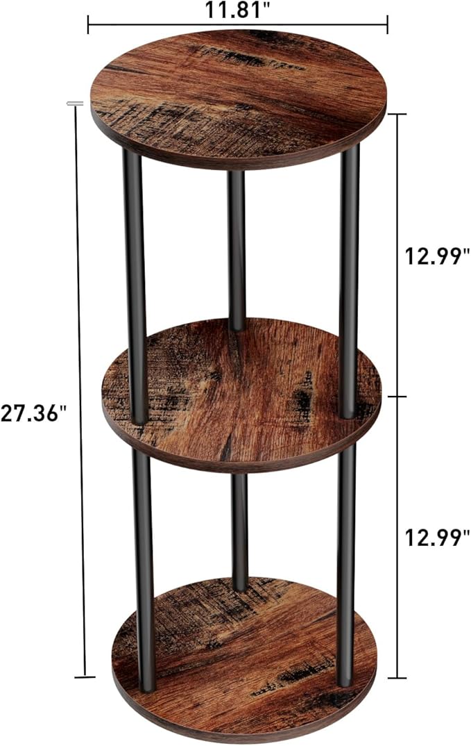 11.8'D Round Drink Table - 3-Tier Small Side Table with Wood Legs, End Table for Small Space, Balcony & Office | Space-Saving, Multi-Functional (Plants, Books, Drinks), Brown
