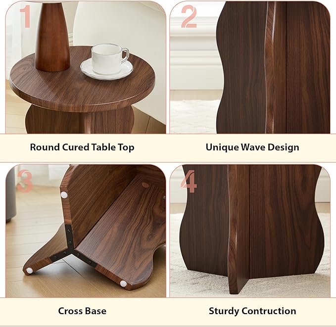 • STRONG & DURABLE --- This modren round side table has made of high quality medium fiber density board, the surface of natural wood grain pattern with waterproof coating, the unique wave legs are strong triangular structure with metal fixing tabs, large enough support area to make this end table is not easy to tip over. The bottom of the legs also have rubber granules, which not only prevent slipping but also reduce noise when moving and protect the floor from scratches.