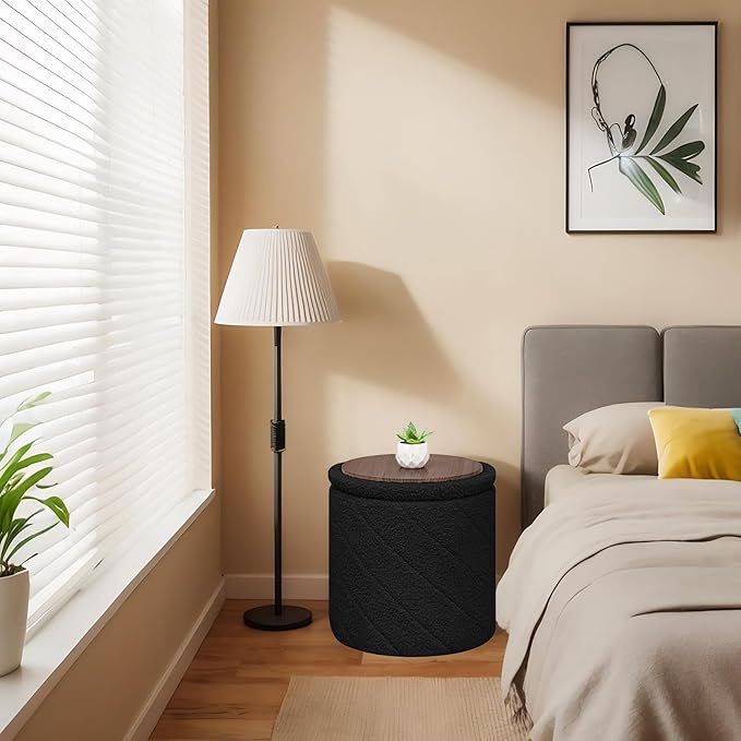 B FSOBEIIALEO Ottoman with Stroage, Boucle Round Storage Ottoman with Tray,Foot Rest Stool for Dorm Room, Living Room Black, 12.99"x12.99"x13.78"