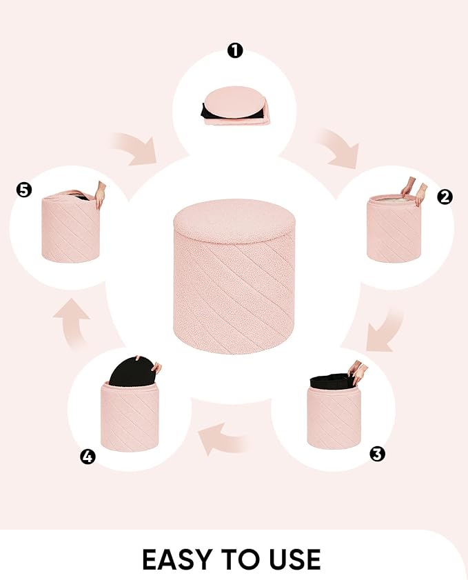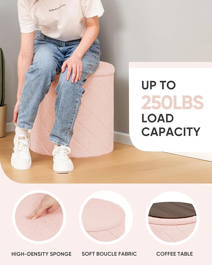 B FSOBEIIALEO Ottoman with Stroage, Boucle Round Storage Ottoman with Tray,Foot Rest Stool for Dorm Room, Living Room Pink, 16.93"x16.93"x17.72"